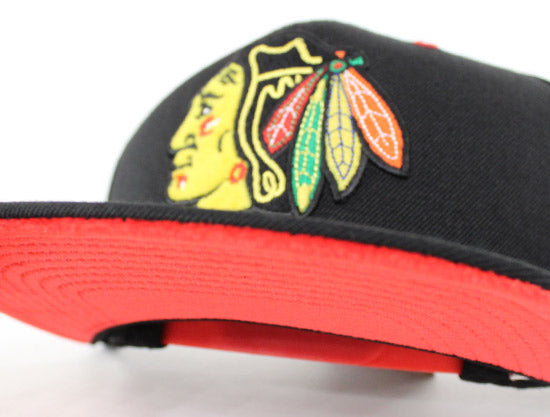 Chicago Blackhawks Mitchell and Ness Snapback hat in Black with a Red Velour Under Brim.