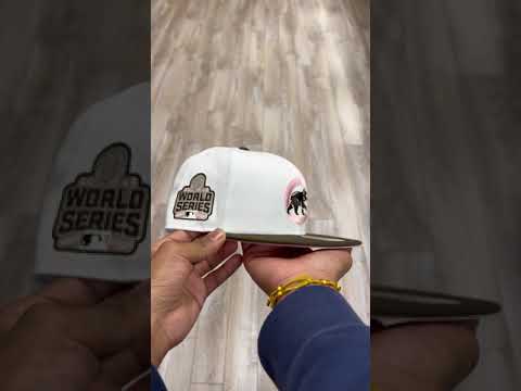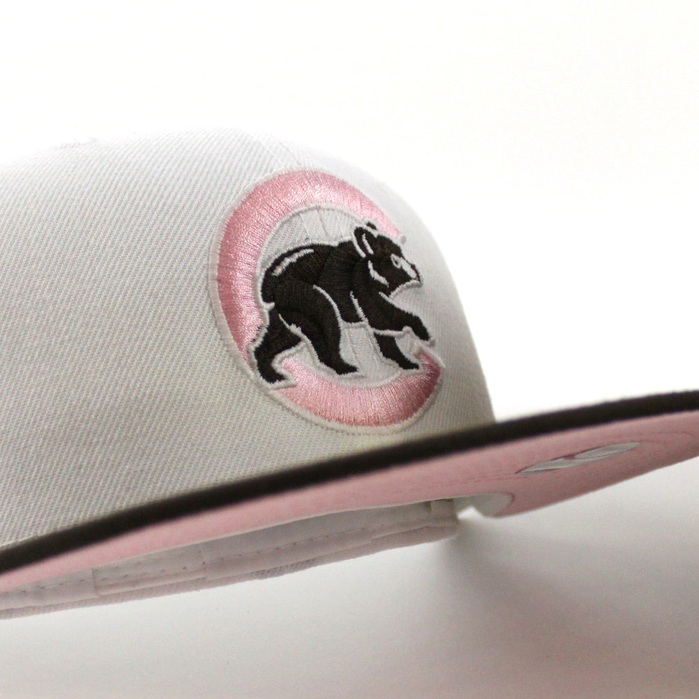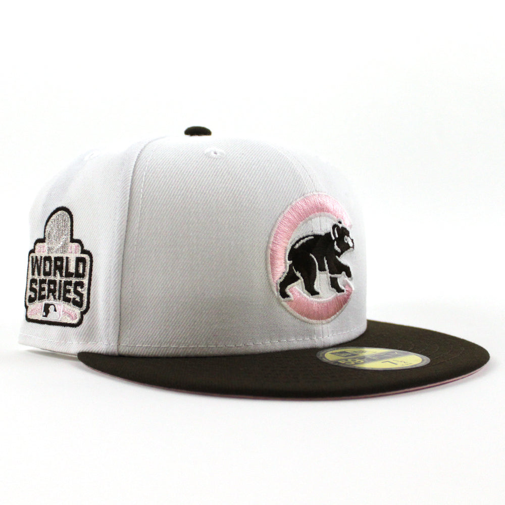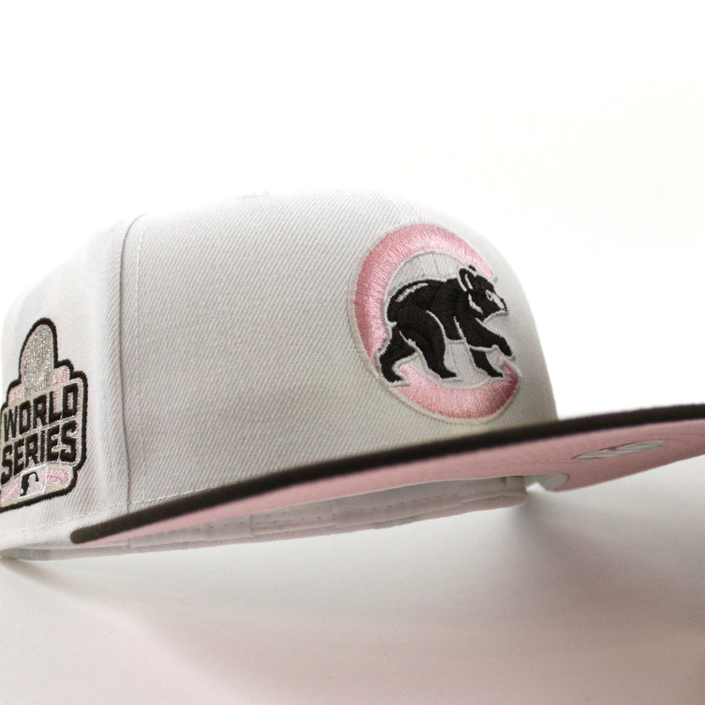 Chicago Cubs 2016 World Series New Era Fitted 59Fifty Cap in White, Brown Visor & Pink Under Brim.
