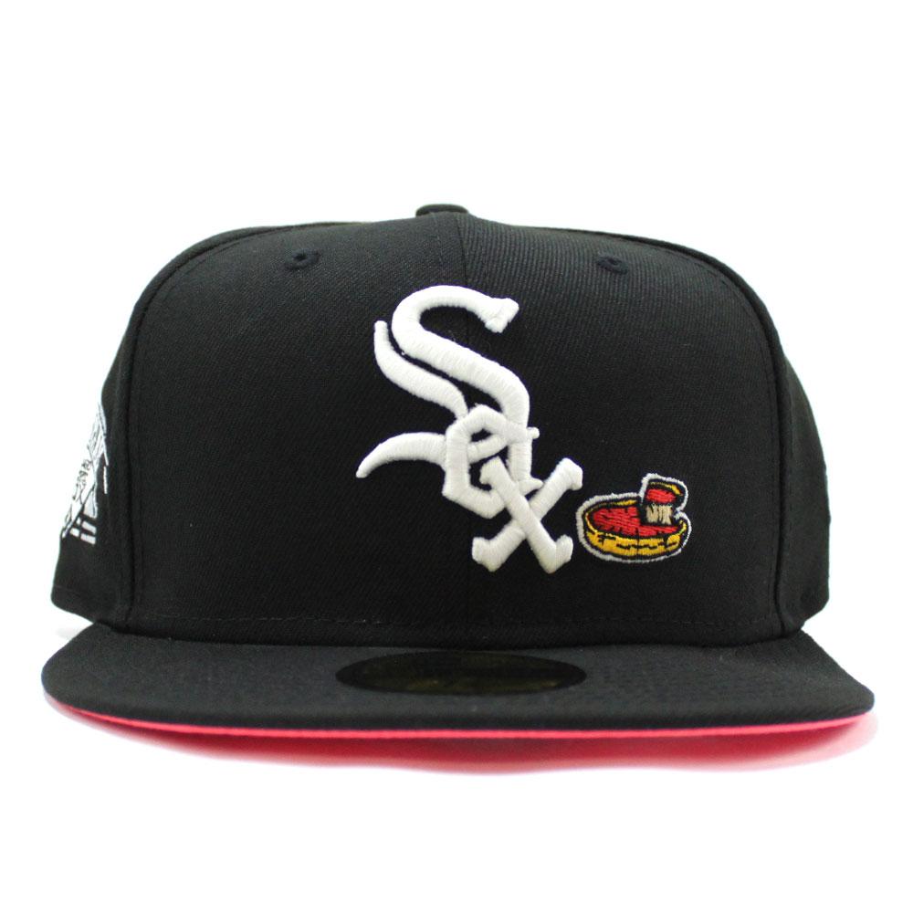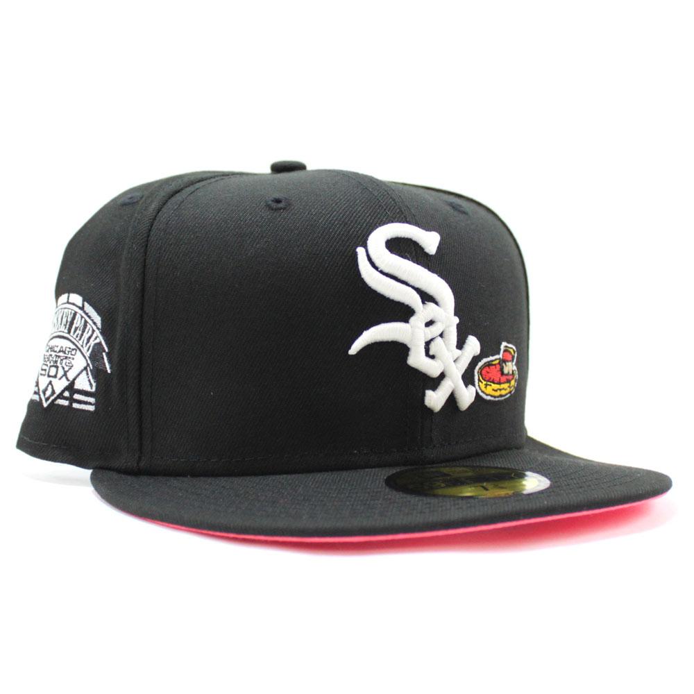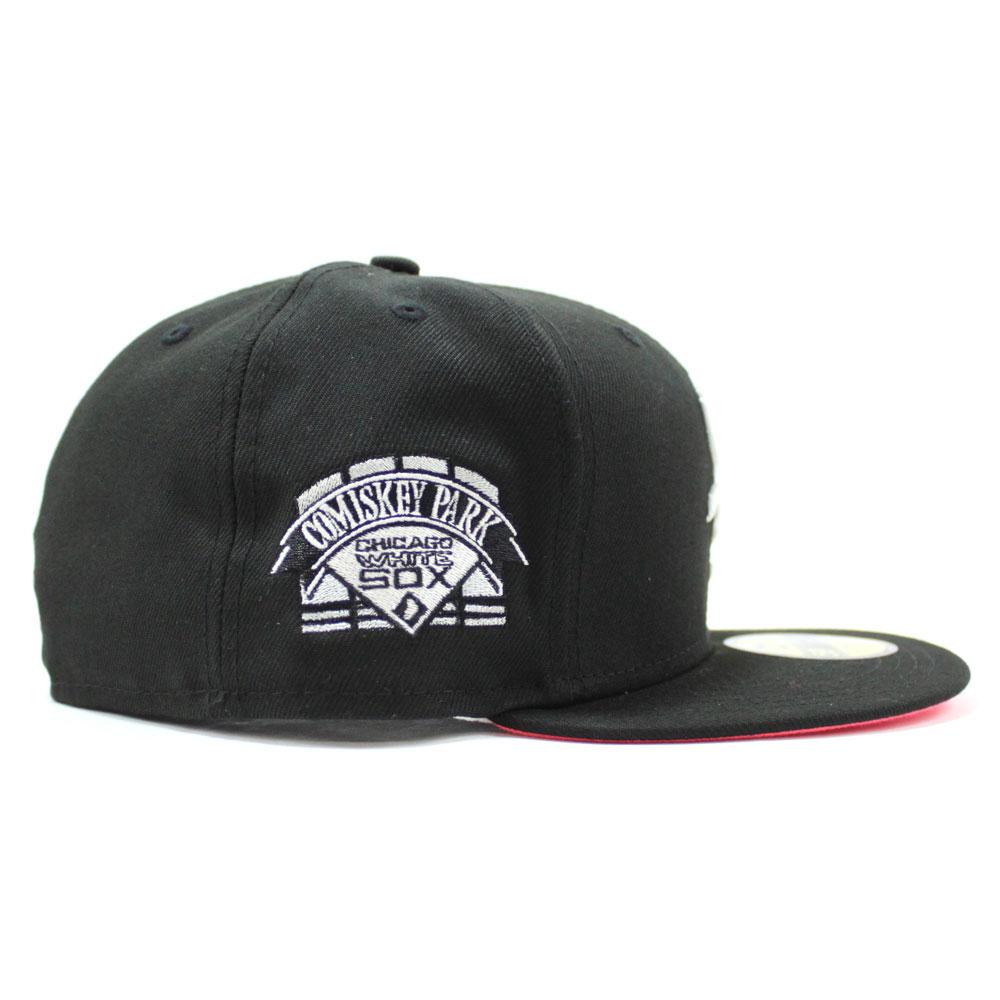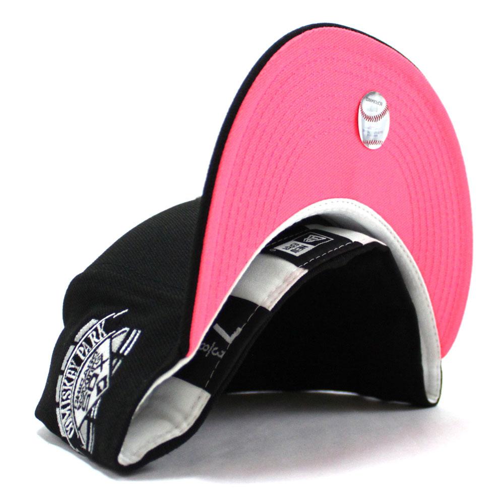 Chicago White Sox Deep Dish Comiskey Park Patch New Era 59Fifty Fitted Hat in Black & Hot Pink Under Brim.