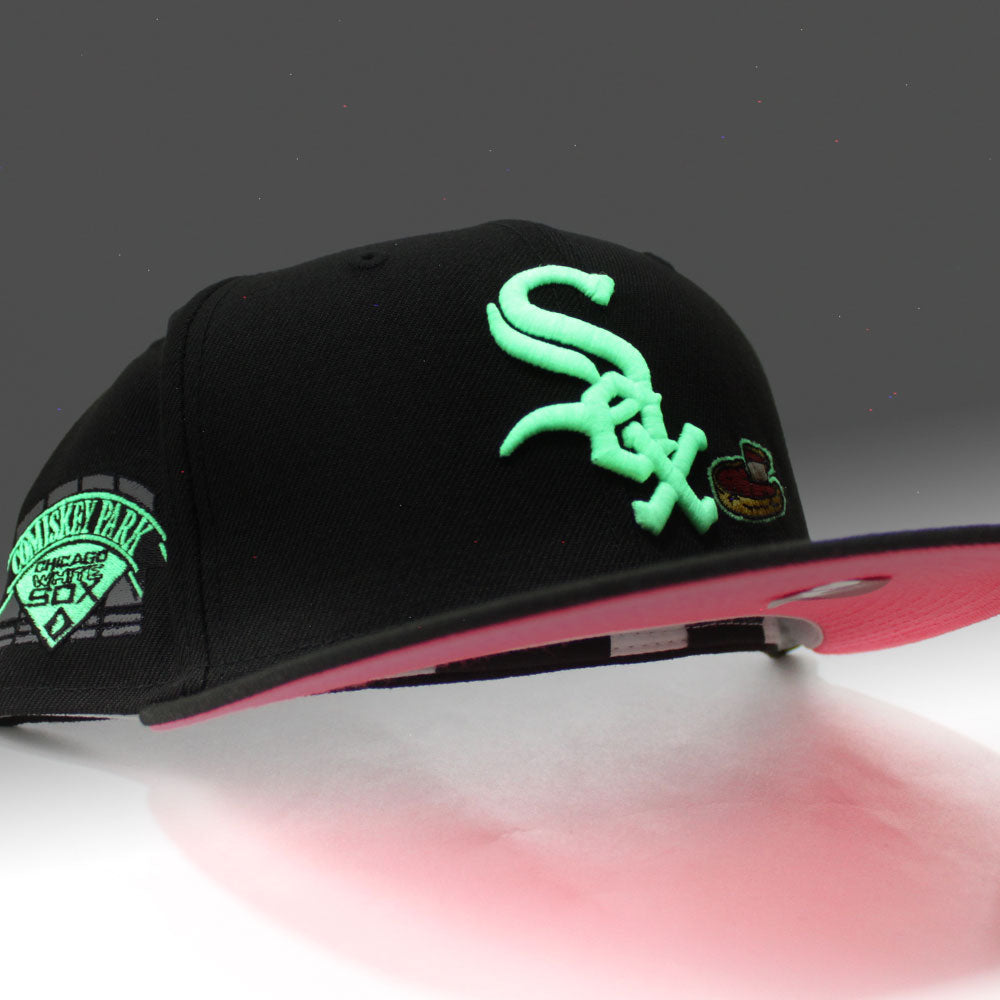 Chicago White Sox Deep Dish Comiskey Park Patch New Era 59Fifty Fitted Hat (Glow in the Dark Logo Black Hot Pink Under Brim)