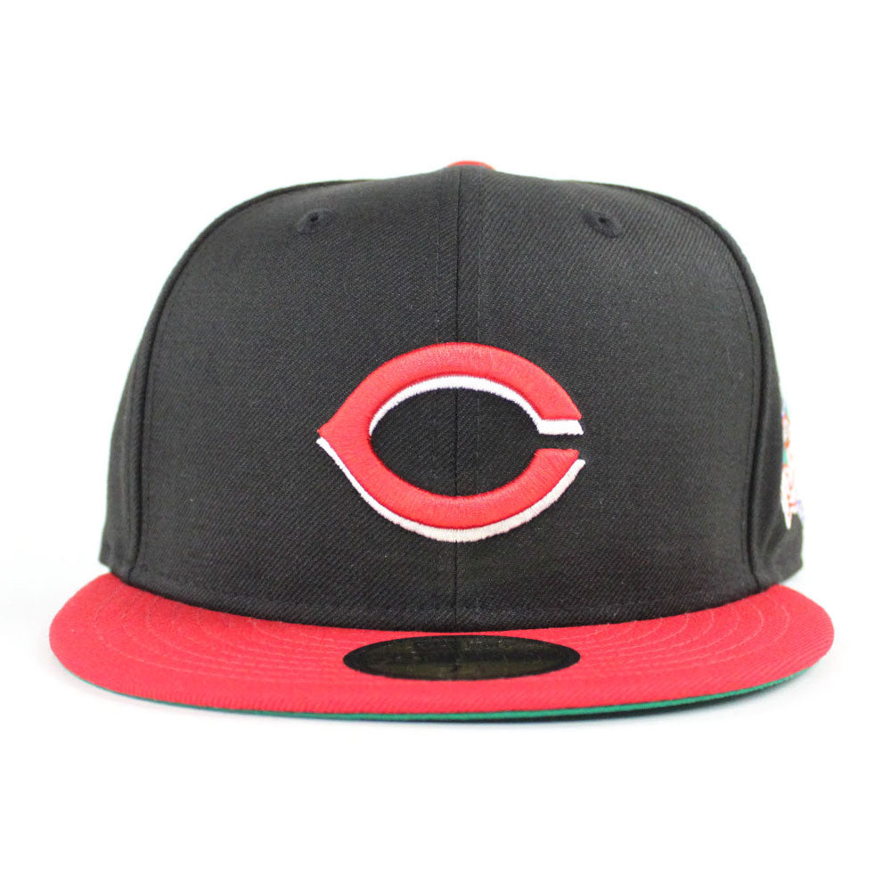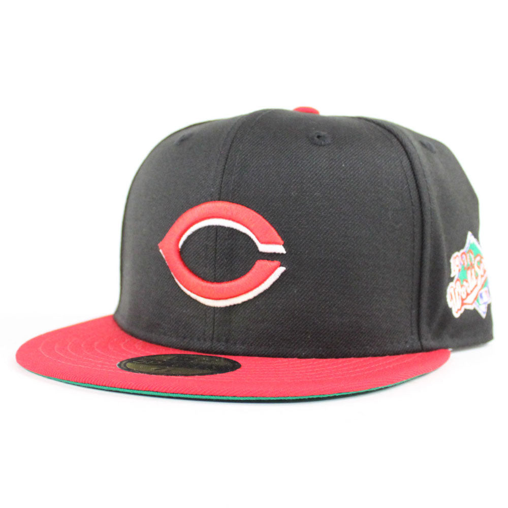 Retro Cincinnati Reds 1990 World Series New Era 59Fifty fitted hat in Black, Red and Green Under Brim.