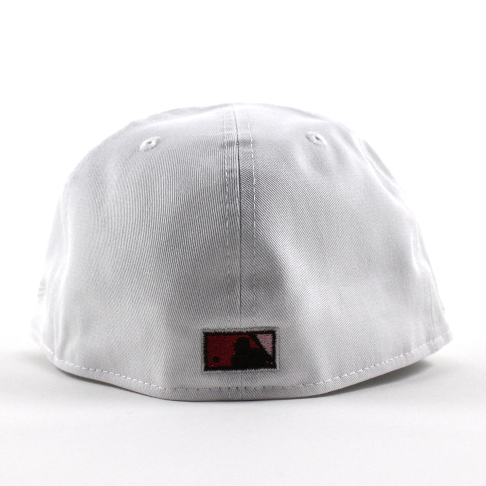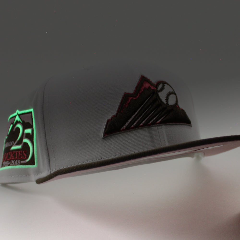 Colorado Rockies 25th Anniversary New Era 59Fifty Fitted Hat in White, Metallic Red with Brown Visor and Pink Under Brim.