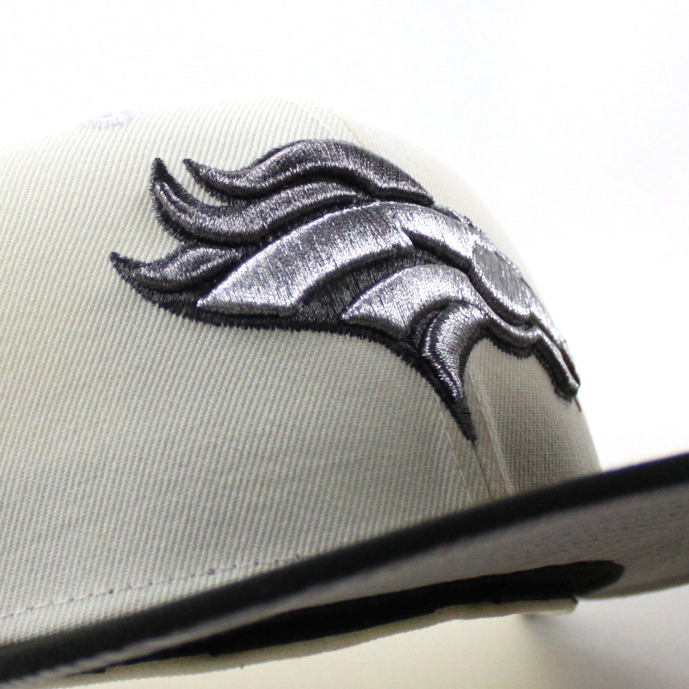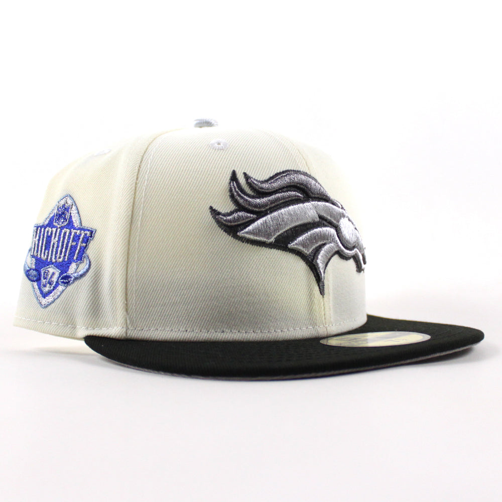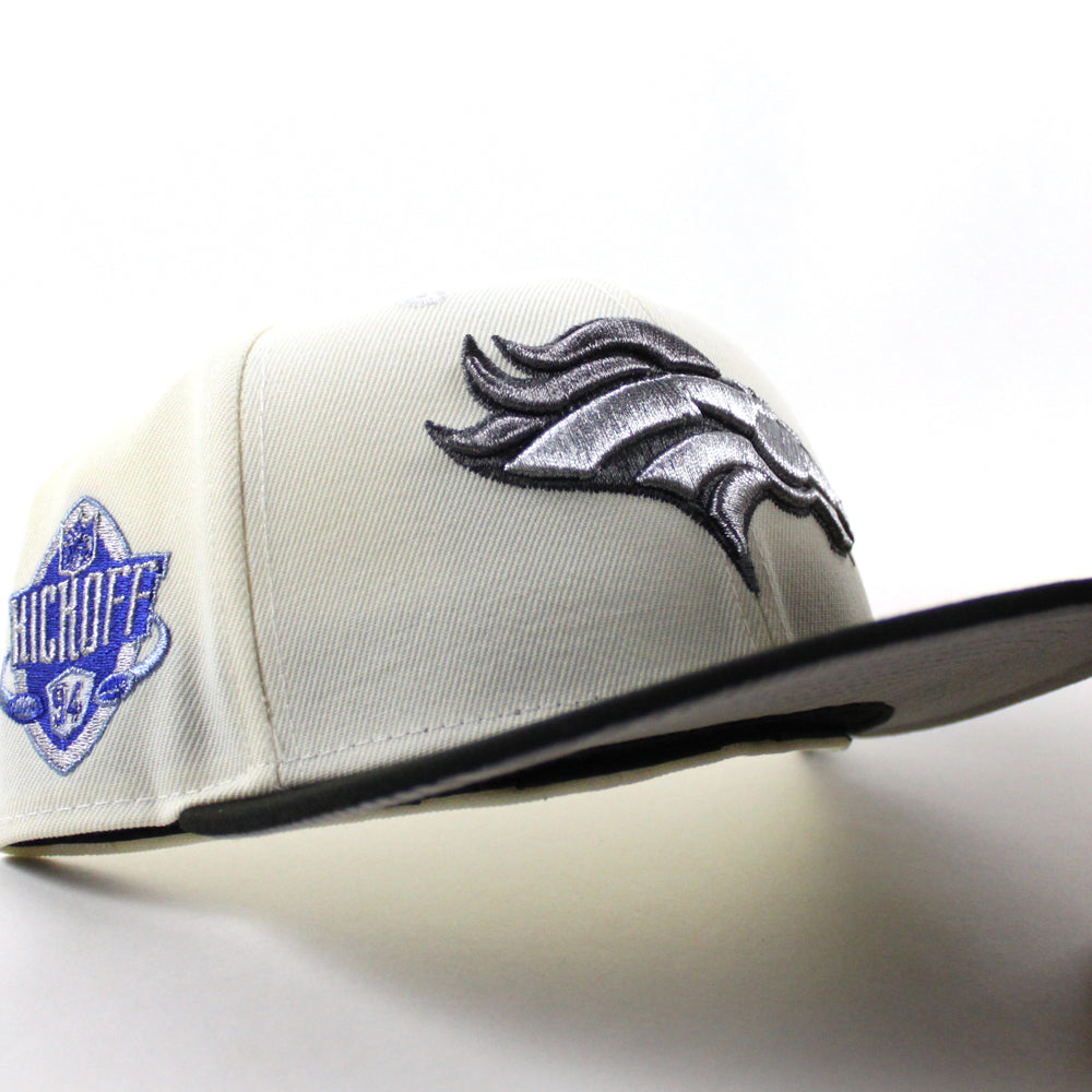 Denver Broncos Kick Off 1994 Era 59Fifty Fitted Hats in Chrome White, Black and Gray Under Brim.