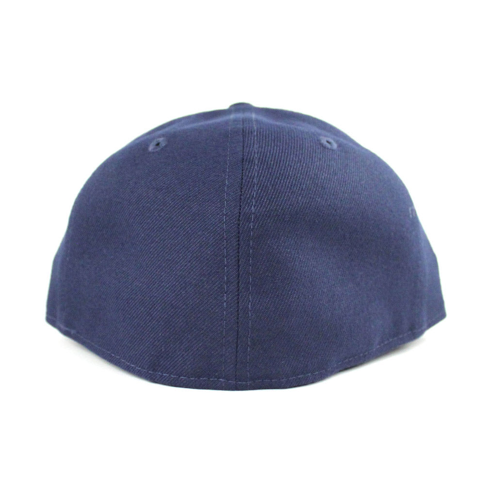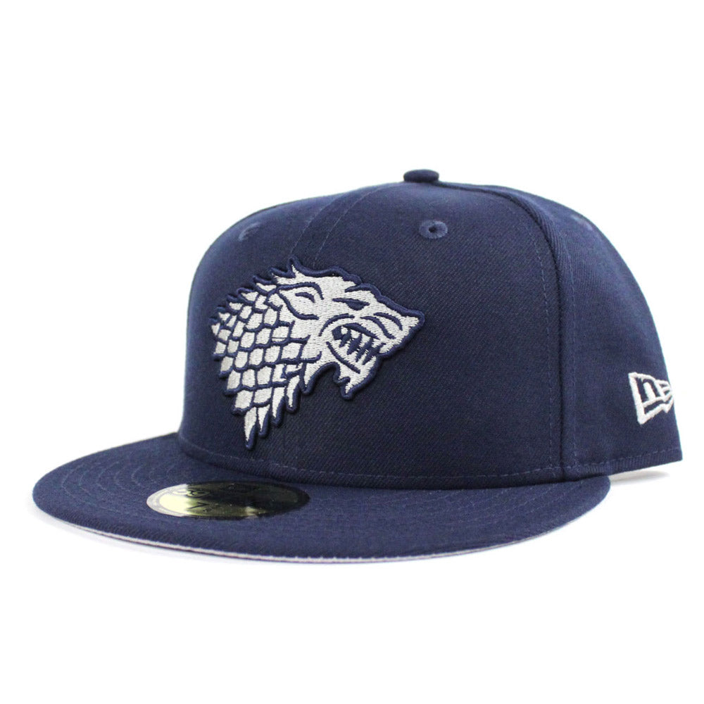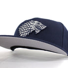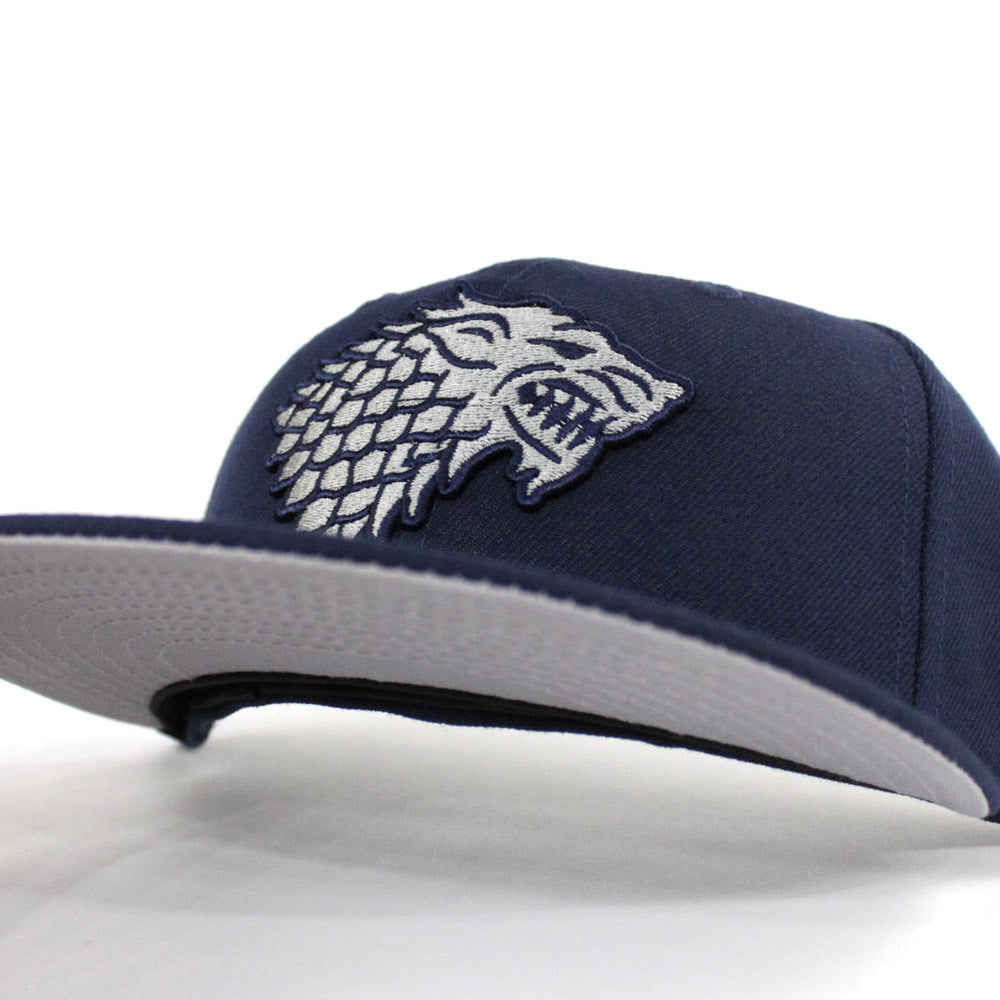 Game of Thrones House Stark of Winterfell Direwolf New Era 59Fifty Fitted Hat is Navy and Gray with Gray Under Brim.