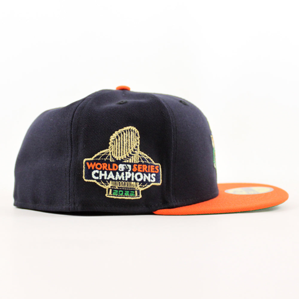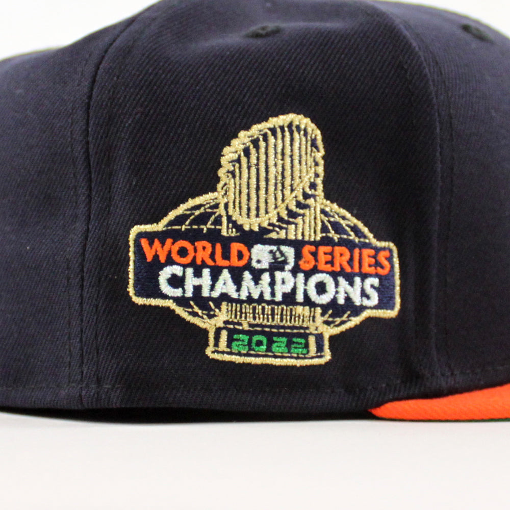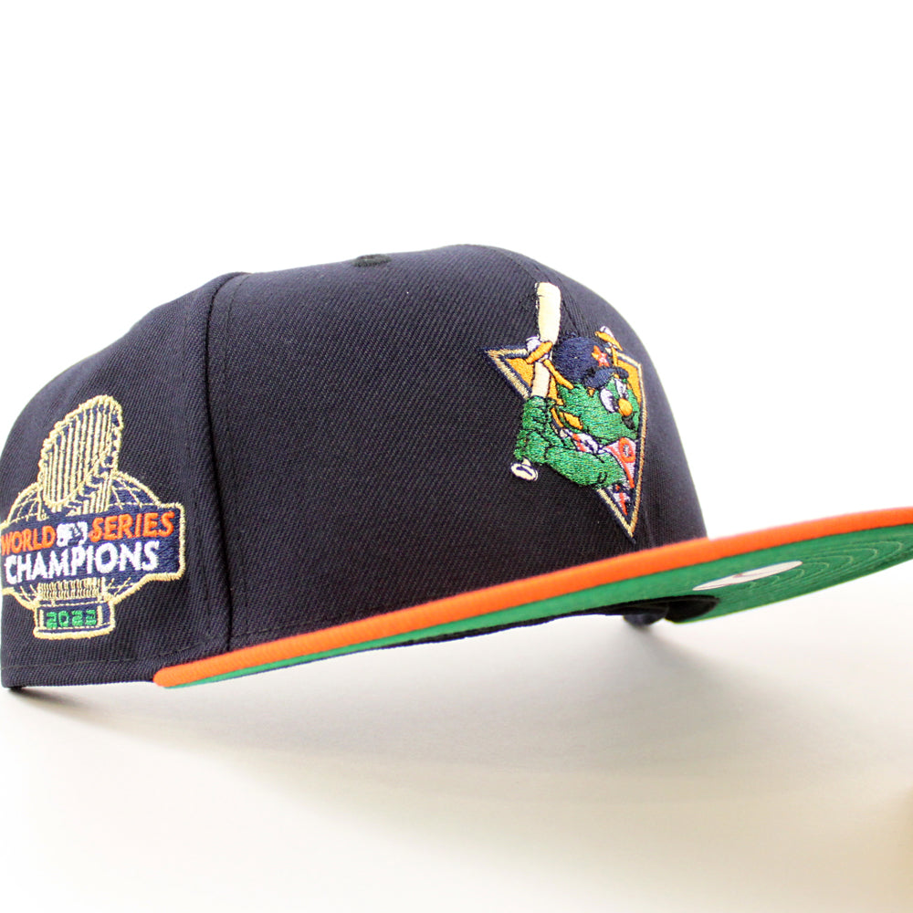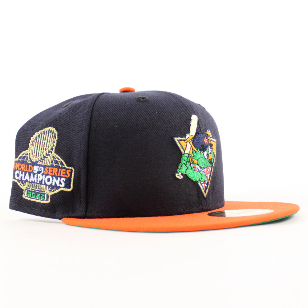 (Orbit Mascot) Houston Astros World Series Champions New Era 59Fifty Fitted Hat in Navy, Orange and Green Under Brim.