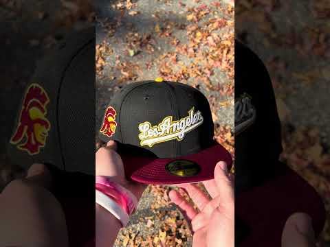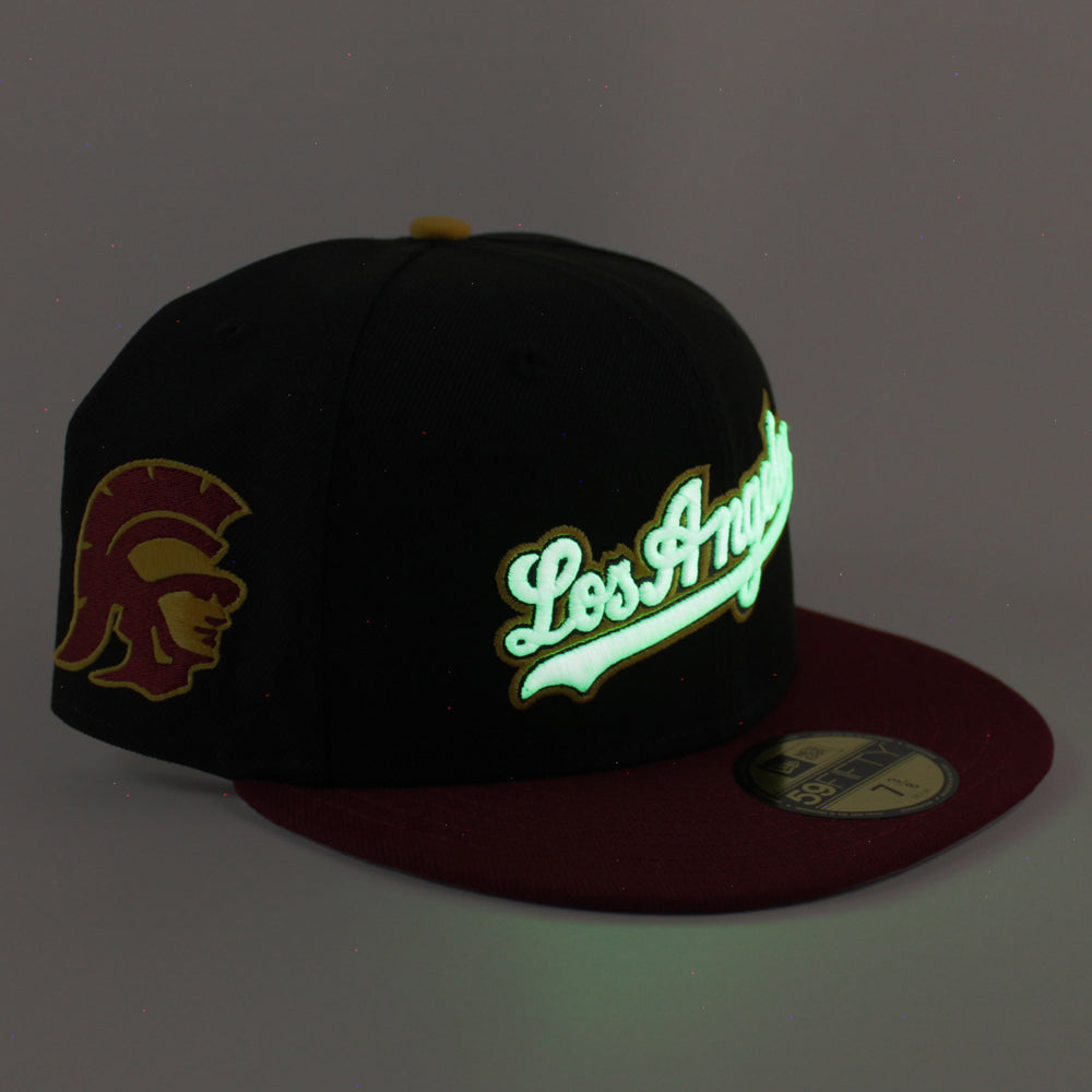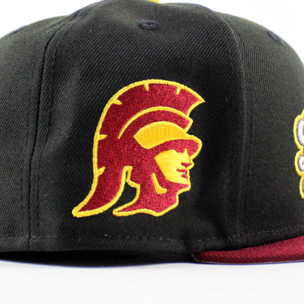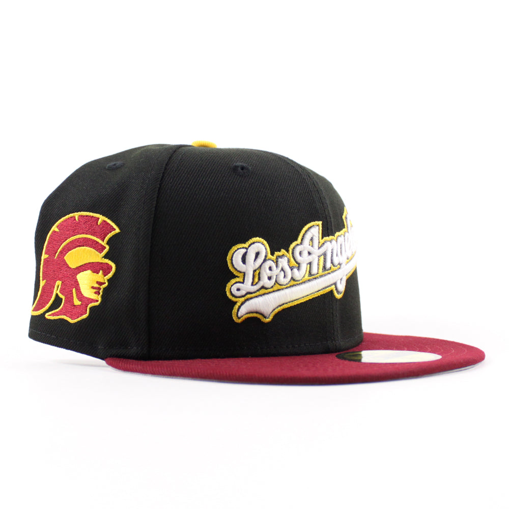 USC x Los Angeles Dodgers New Era 59Fifty Fitted Hat in Black, Cardinal Red and Gray Under Brim.