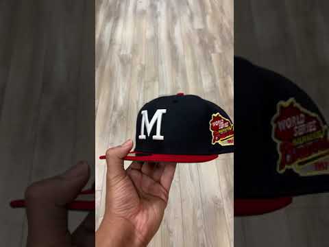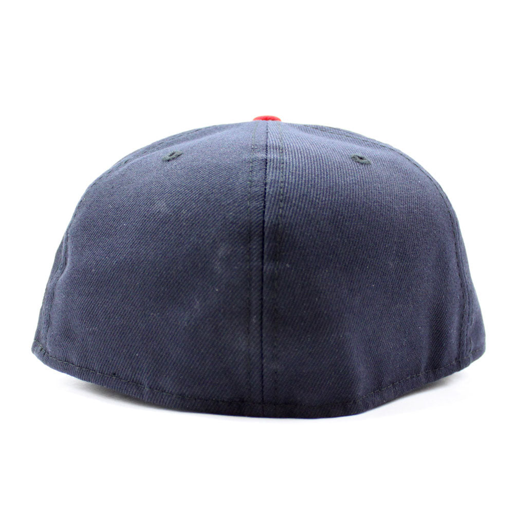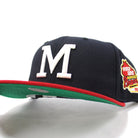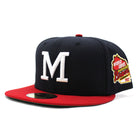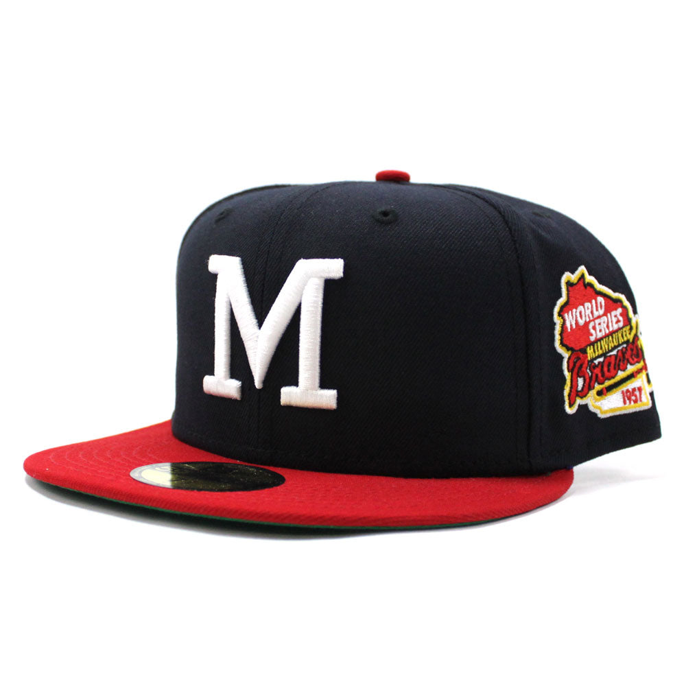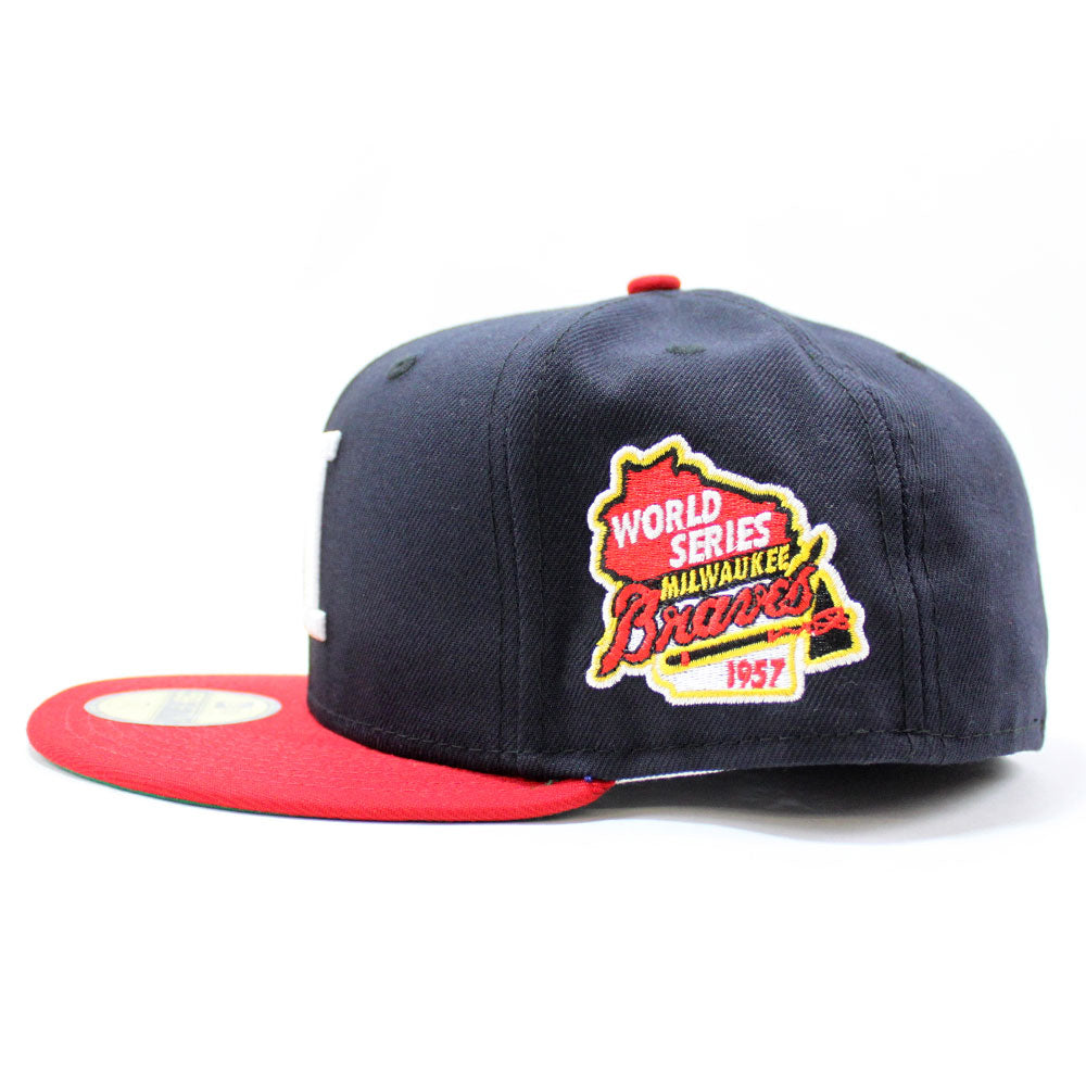 The New Era 59Fifty Fitted Cap featured is the Milwaukee Braves in their old school team colors of Navy and Red. The Milwaukee Braves New Era 59Fifty Fitted Hat also has a 1957 World Series Side Patch with a Green under brim.