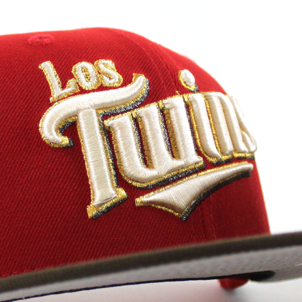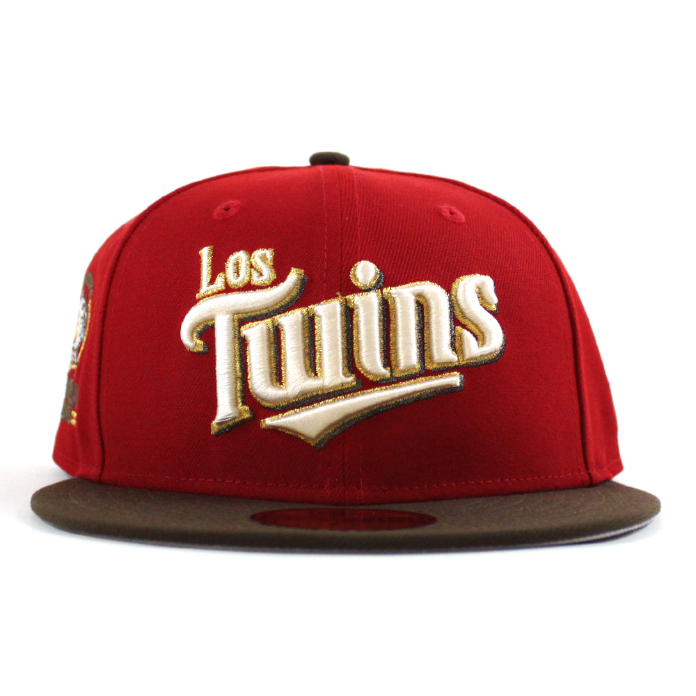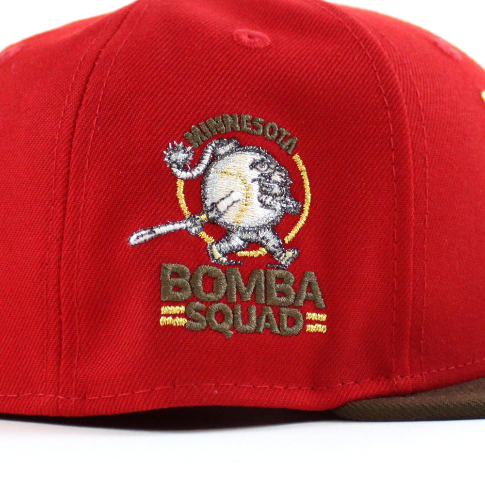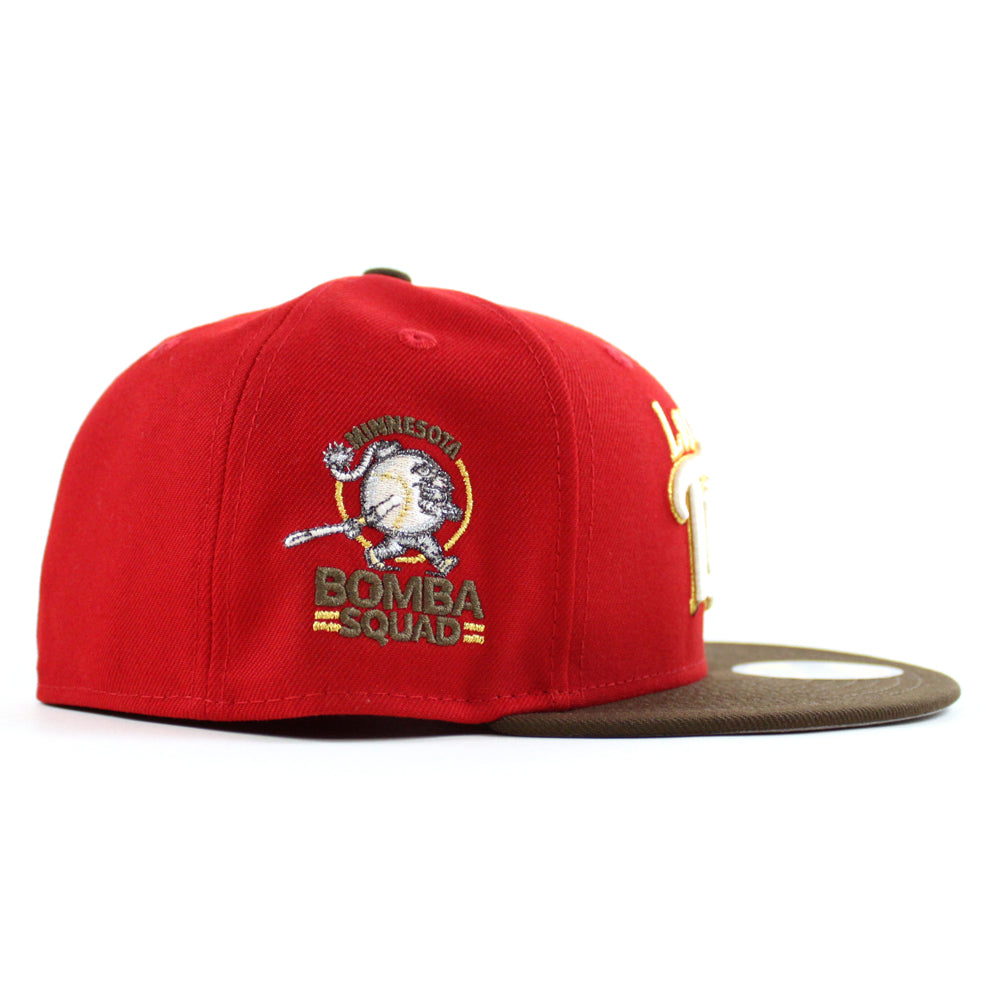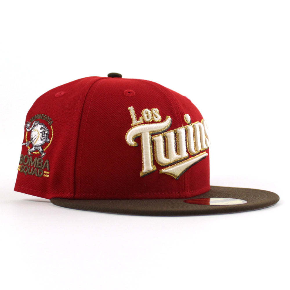 Minnesota Twins (Los Twins) Bomba Squad New Era Fitted Hat in Scarlet Red, Walnut and Gray Under Brim.