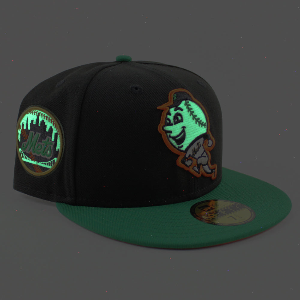 New York Mets Mets Skyline New Era 59Fifty Fitted Hat (GITD Black Kelly Green Orange Under Brim)