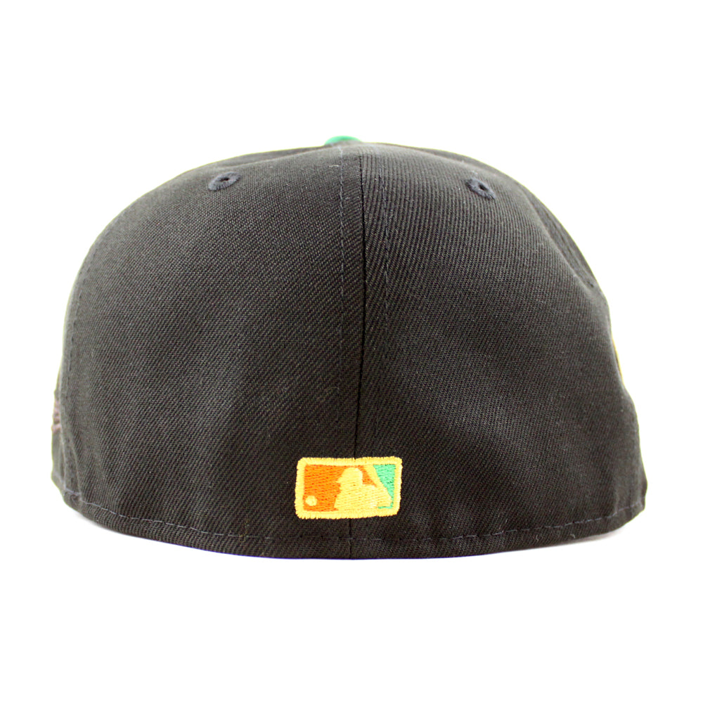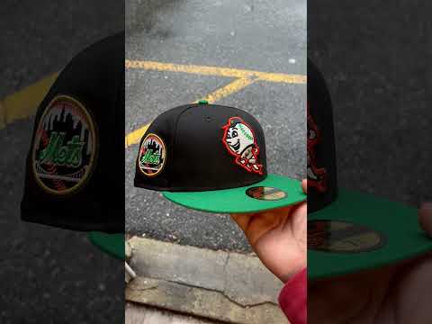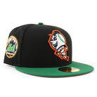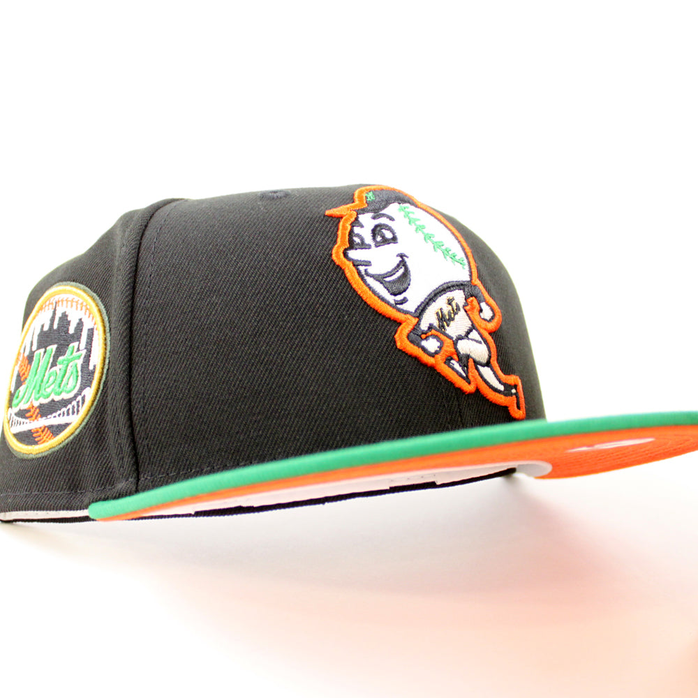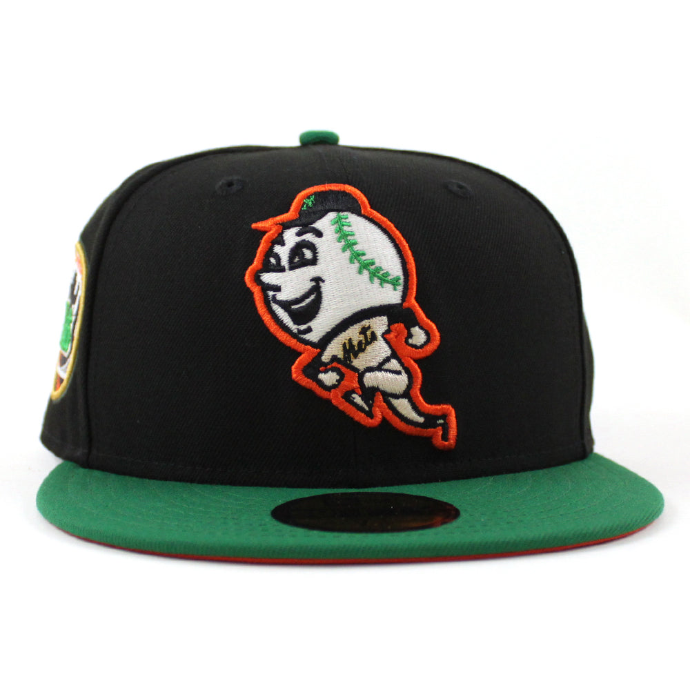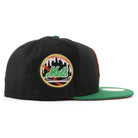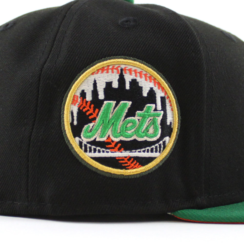 New York Mets Mets Skyline New Era Fitted Hat in Black, Kelly Green and Orange Under Brim.