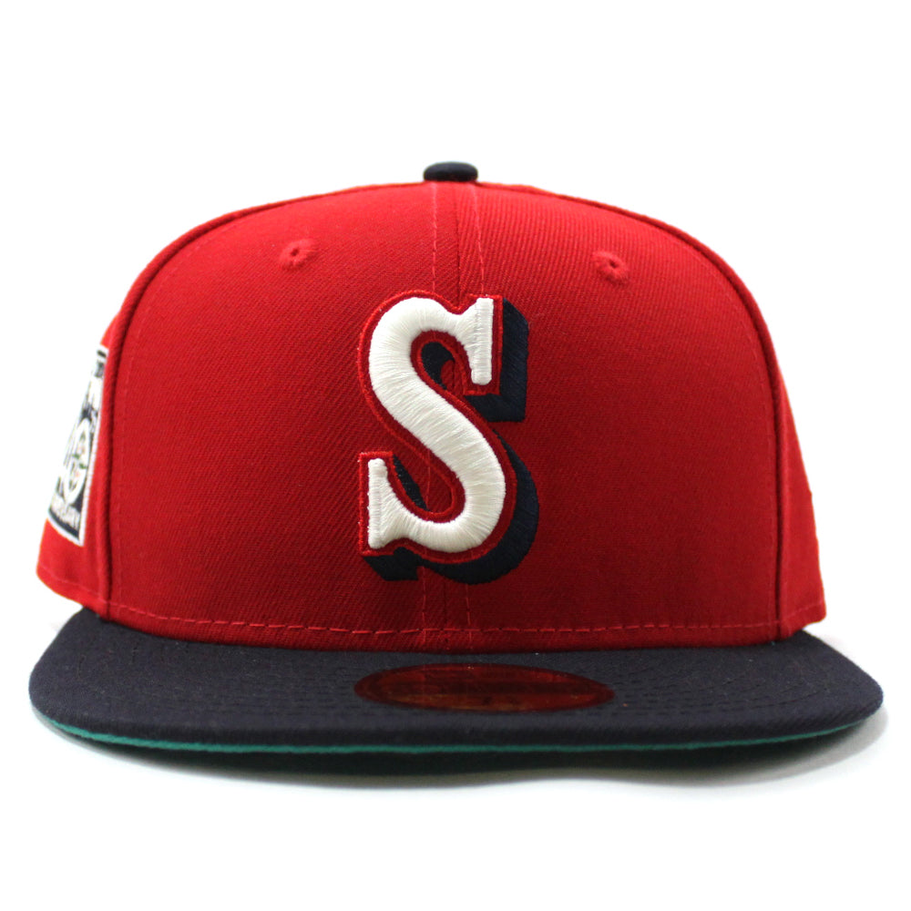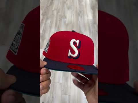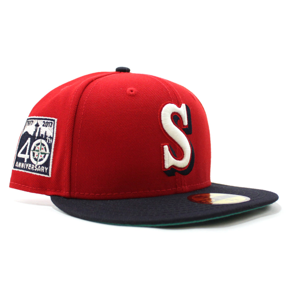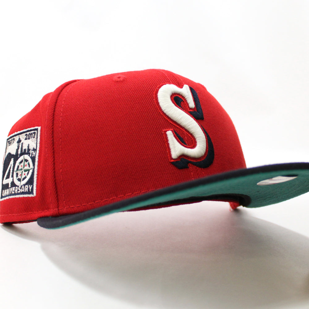 Seattle Mariners 40th Anniversary New Era 59Fifty Fitted Hat in Red, Navy & Aqua Under Brim.