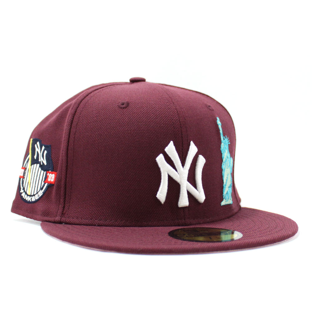 New York Yankees Statue of Liberty 27 World Championships 59Fifty New Era Fitted Hat in Maroon with Pink Under Brim