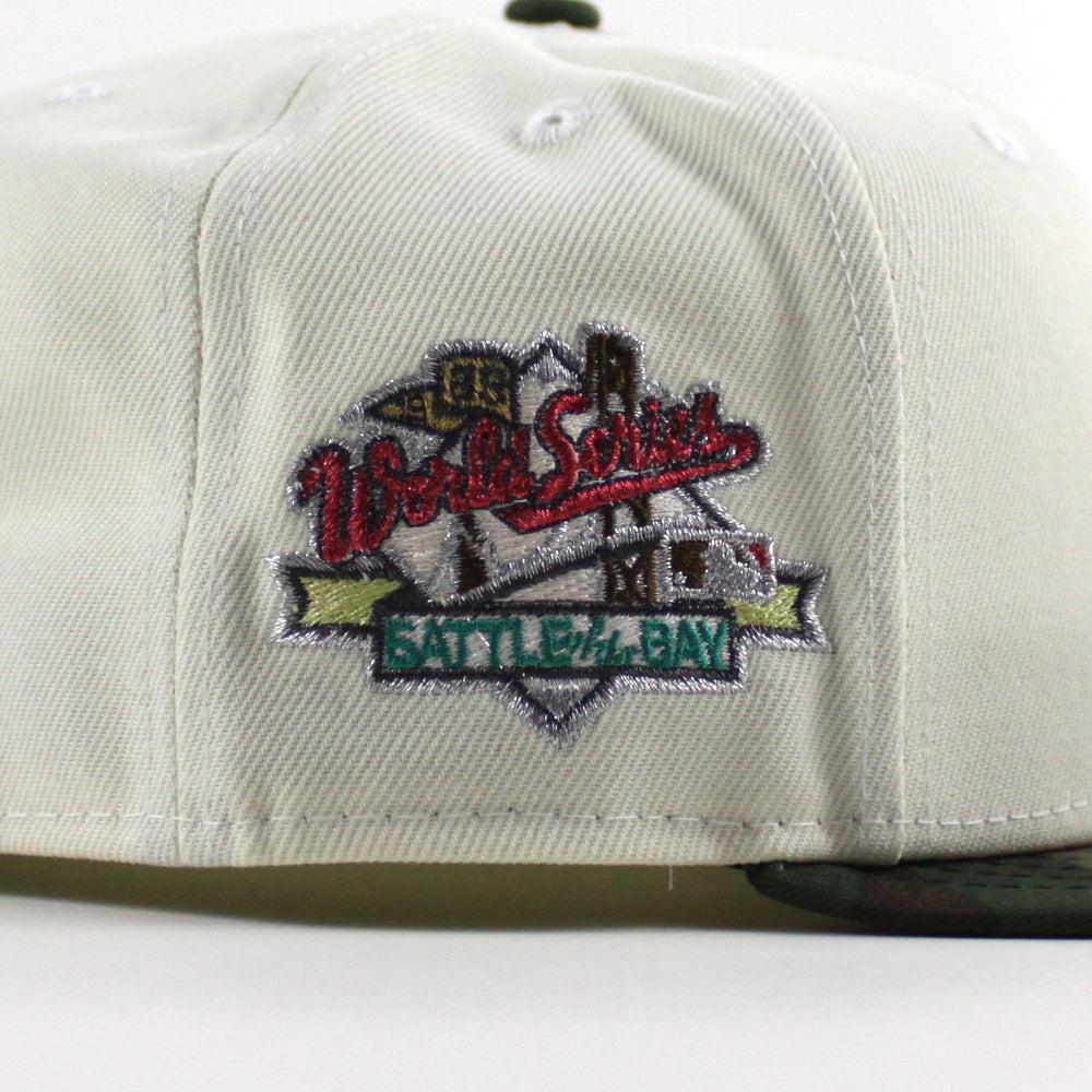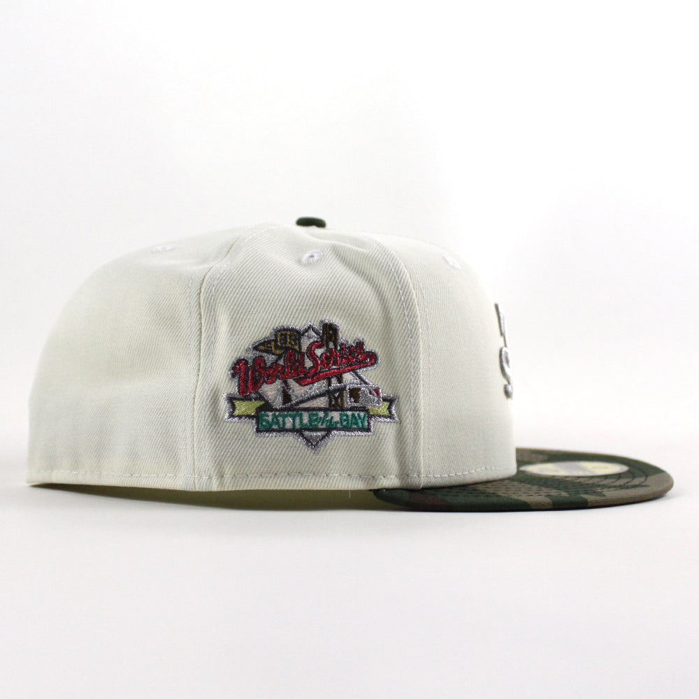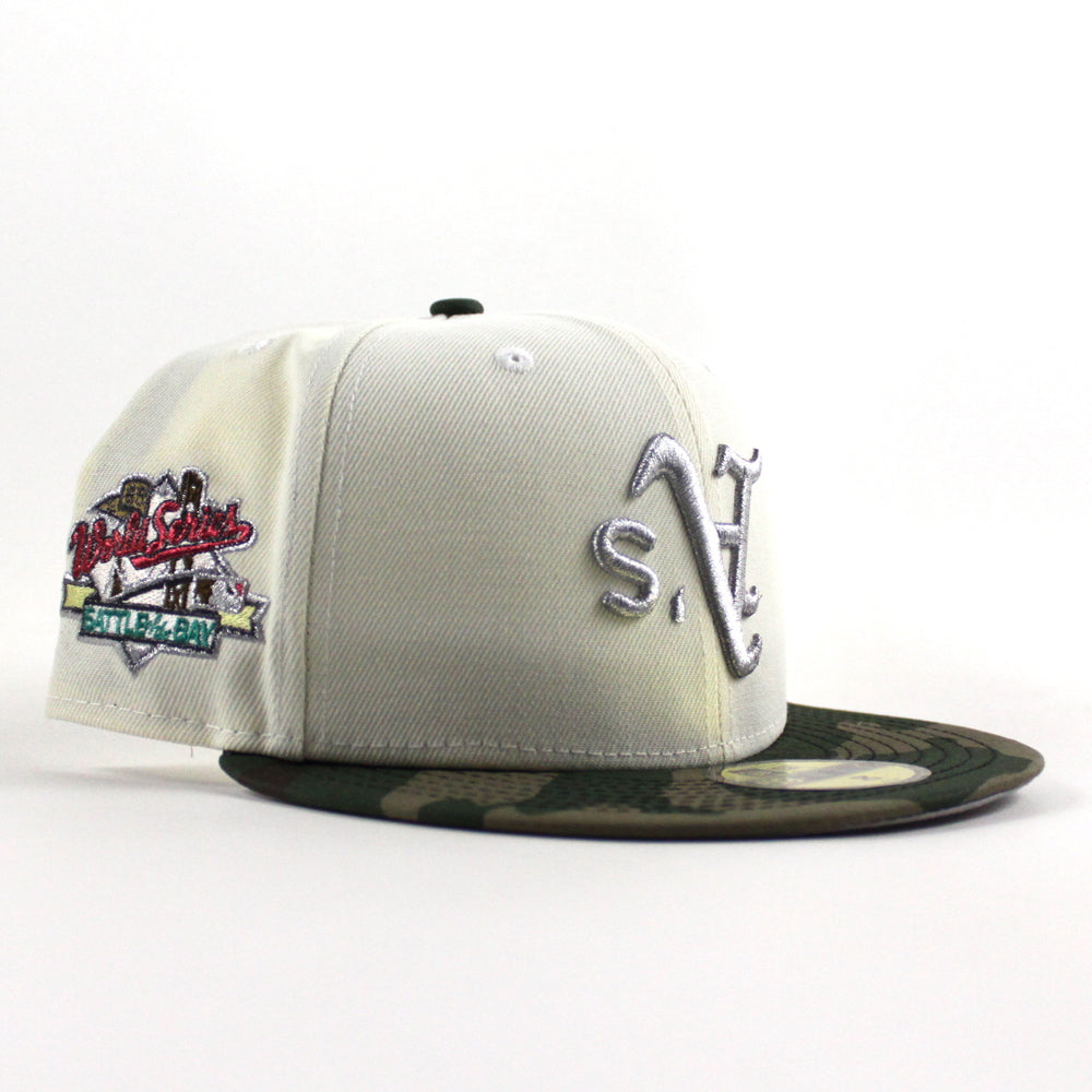 Oakland Athletics 1989 World Series New Era 59Fifty Fitted Cap in Chrome White, WoodLand Camo and Gray Under Brim.