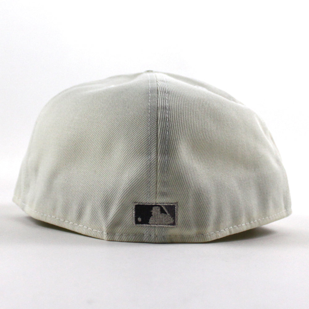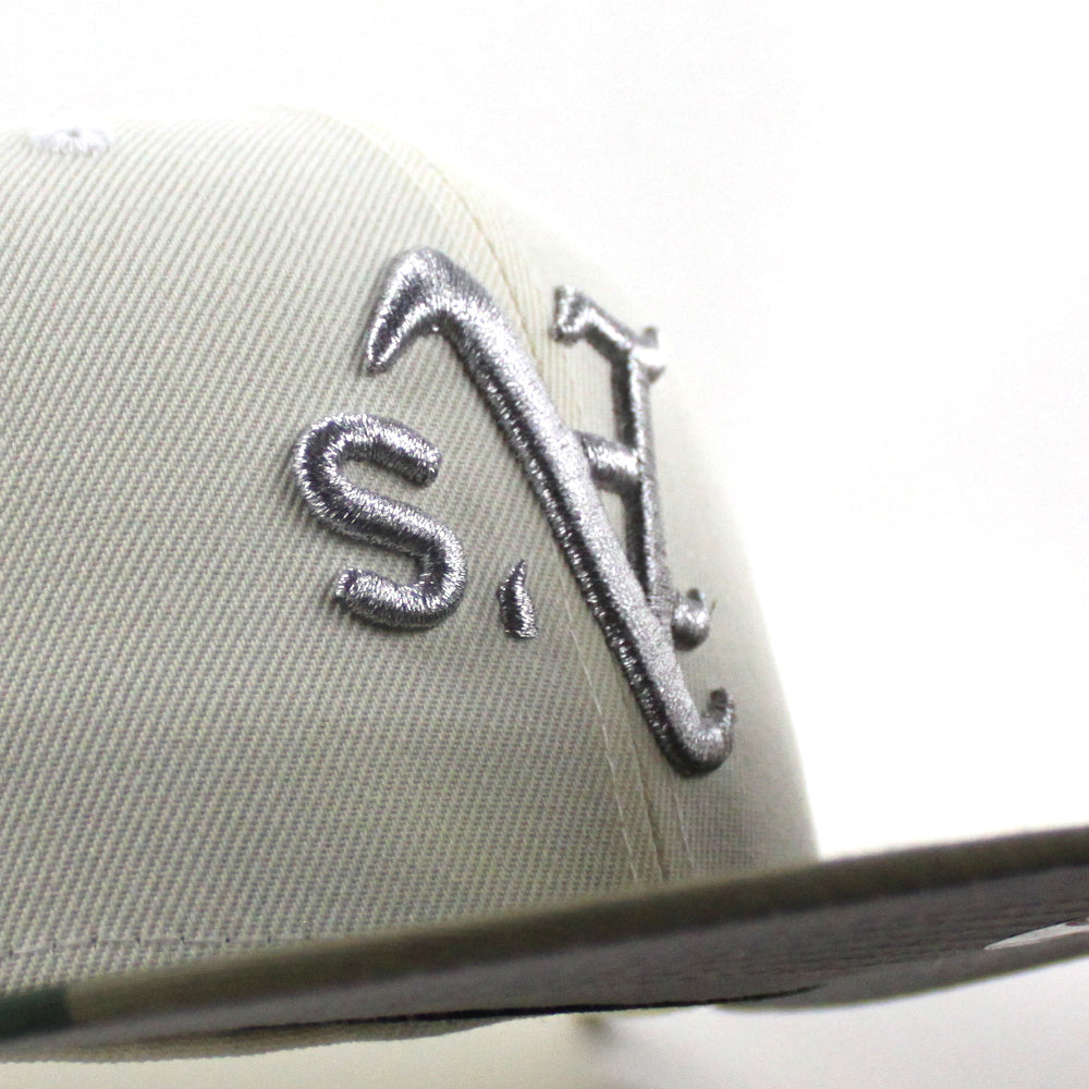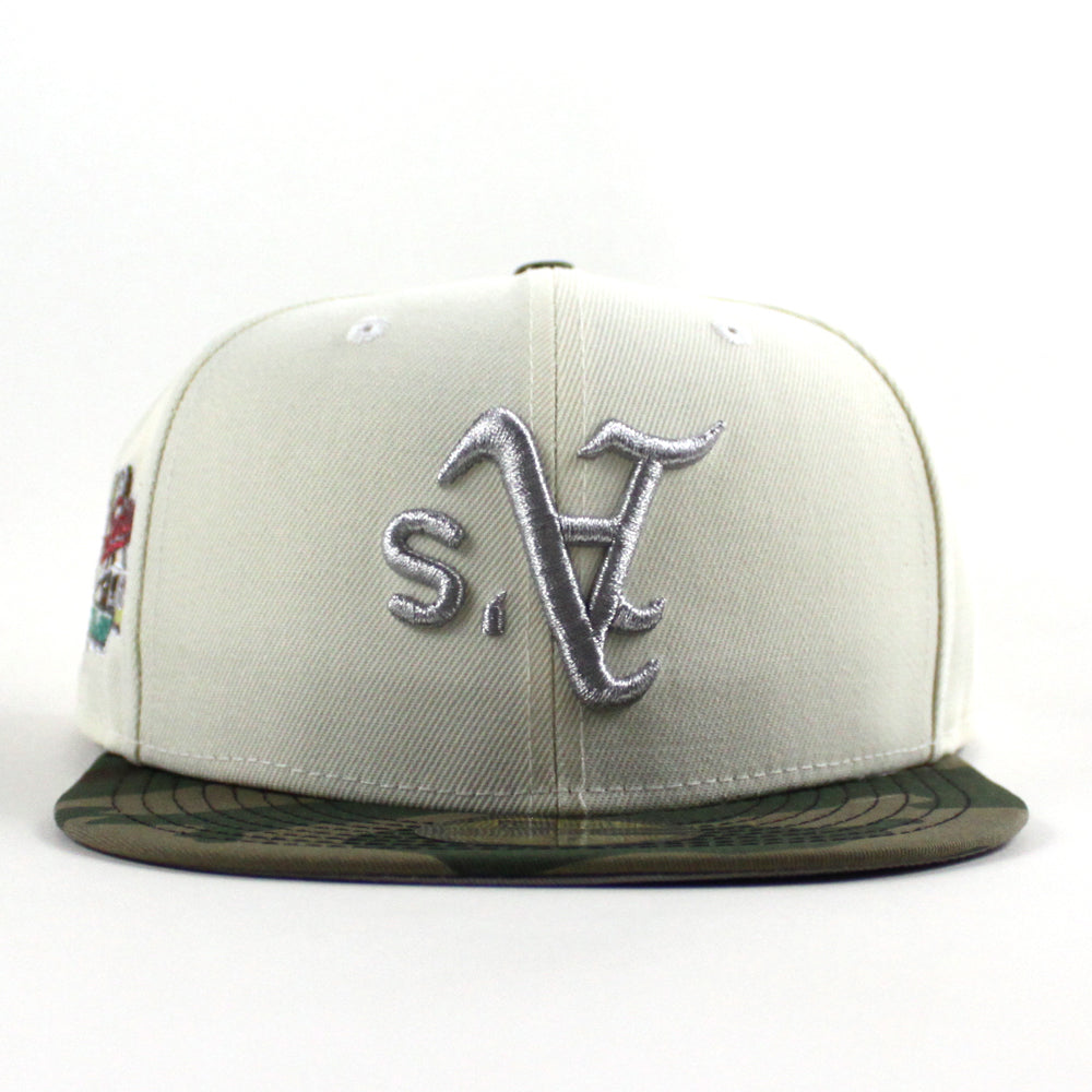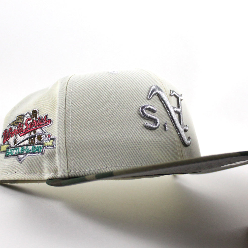 Oakland Athletics 1989 World Series New Era 59Fifty Fitted Cap in Chrome White, WoodLand Camo and Gray Under Brim.