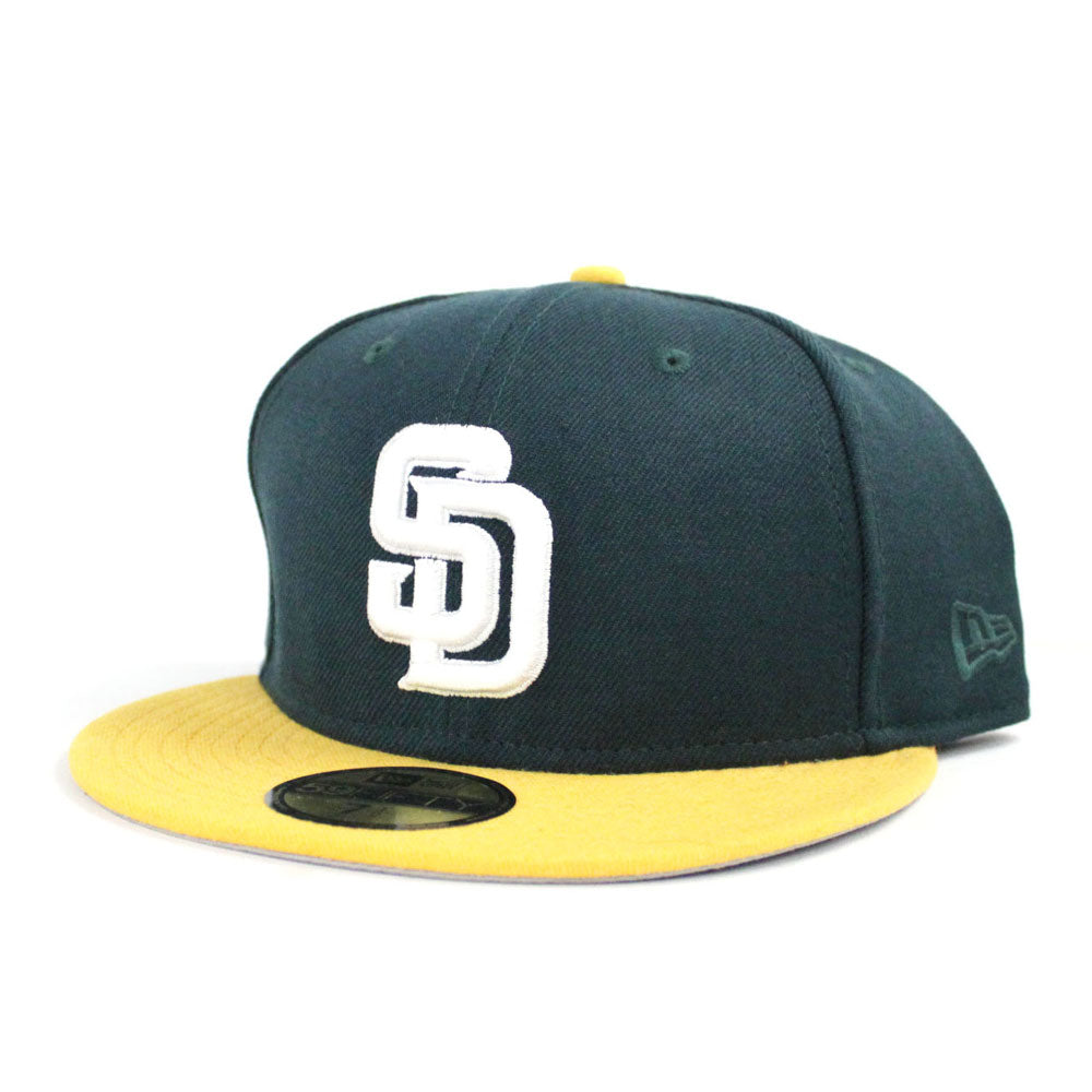 This San Diego Padres New Era 59Fifty fitted hat is done in the Oakland Athletics team color way. The Crown is hunter green with a yellow brim. THe under brim is gray and the logo is white. A's COLORS Way
