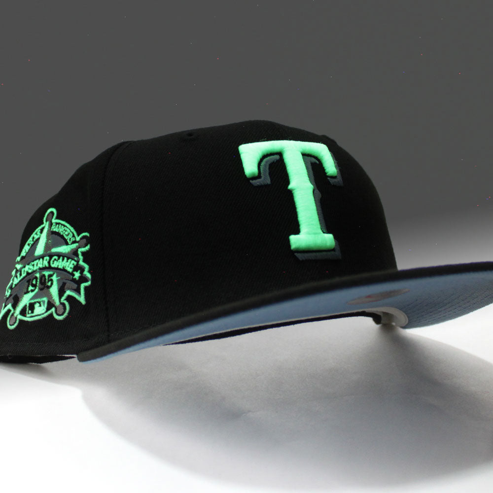 Texas Rangers 1995 All-Star Game New Era 59Fifty Fitted Hat (Glow in the Dark Black Sky Blue Brim)