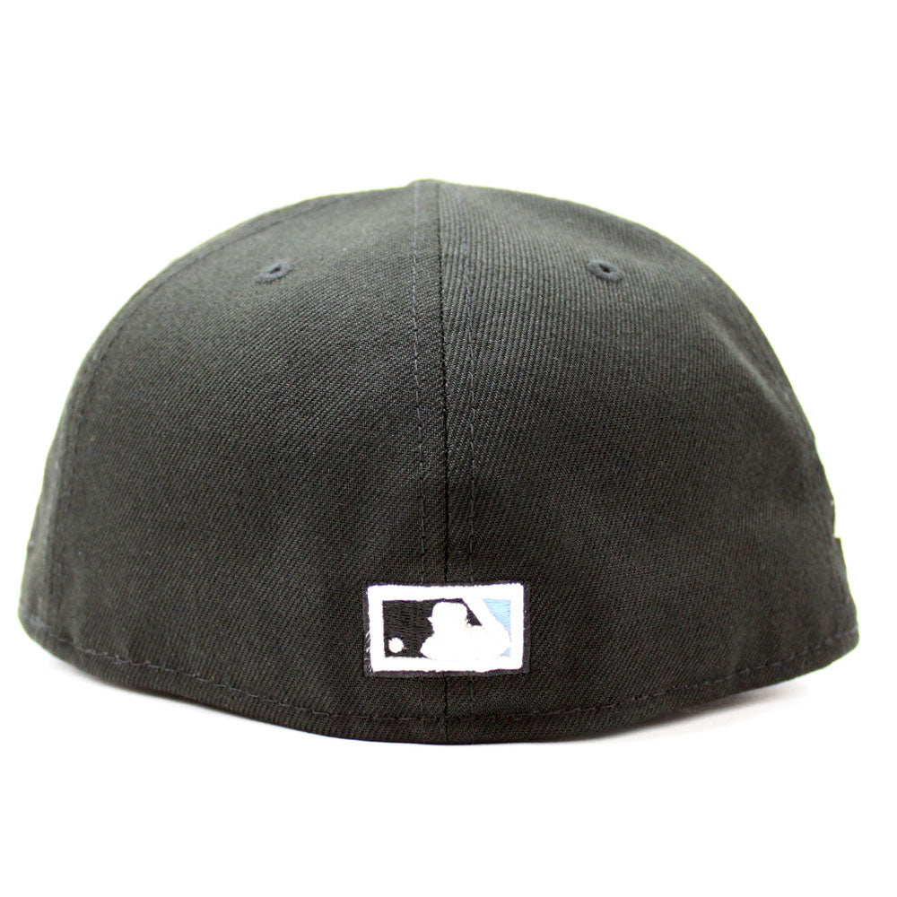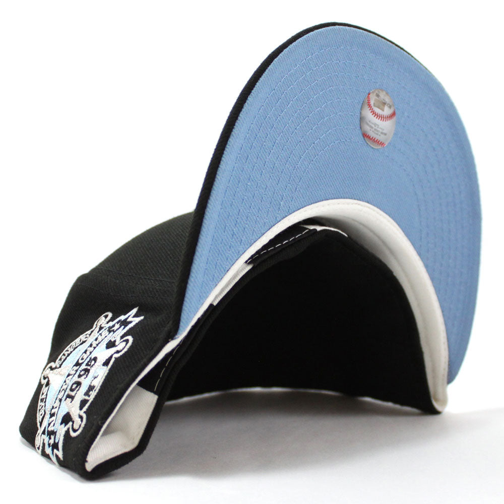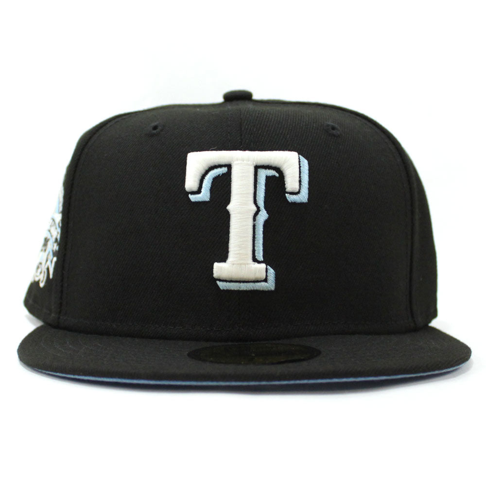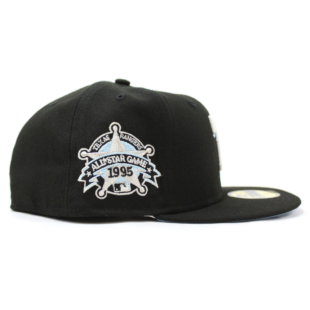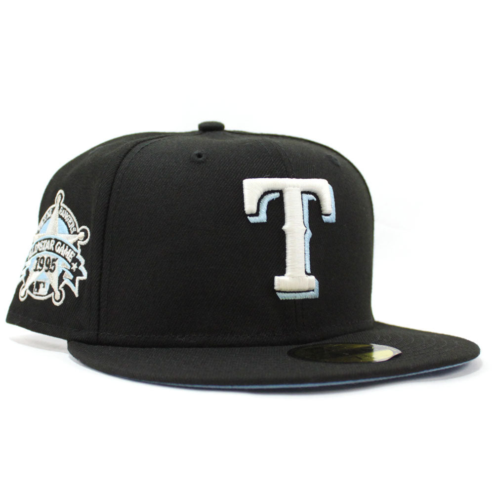 Texas Rangers 1995 All-Star Game New Era 59Fifty Fitted Hat in Black and Sky Blue under brim.